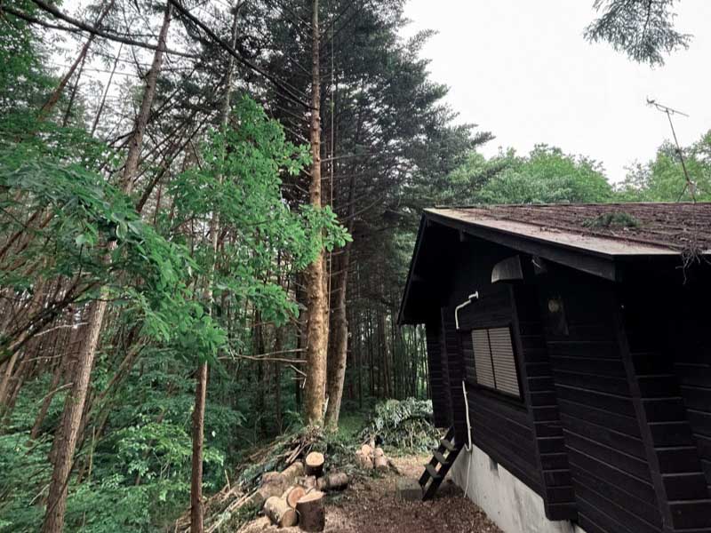 屋根に大きく傾いた1本のモミの木。今すぐ倒木する心配はありませんが、根本から斜めにますぐ伸びているため木が成長するにつれ、どうしても危険度は年々上がっていきます。