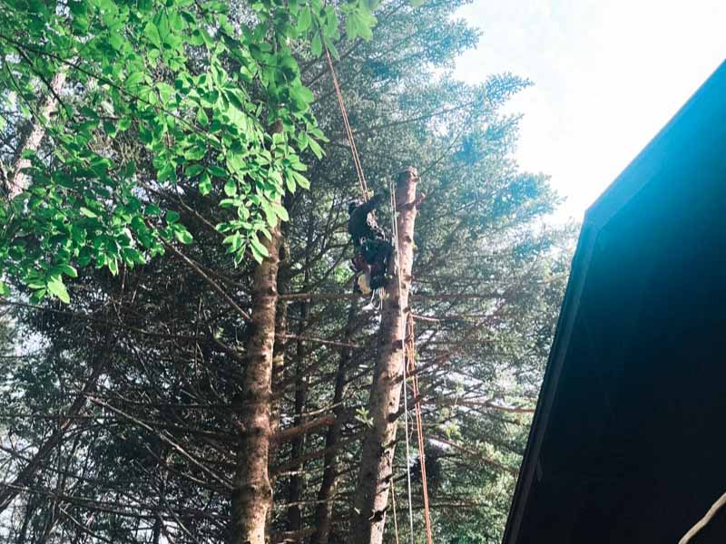 一発で倒す場所がないため特殊伐採を選択。加えて斜めの木に直接登ることも危険なため、隣のまっすぐ伸びたもう1本のモミに命綱のクライミングロープをセット。